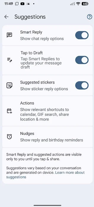 Smart Reply leverages on-device AI to provide quick response options. For instance, if a friend asks, "Are we still on for dinner at 7 pm?" possible Smart Reply options might include "Absolutely!" or "See you there!" By tapping on these responses, users can save time while replying to messages.