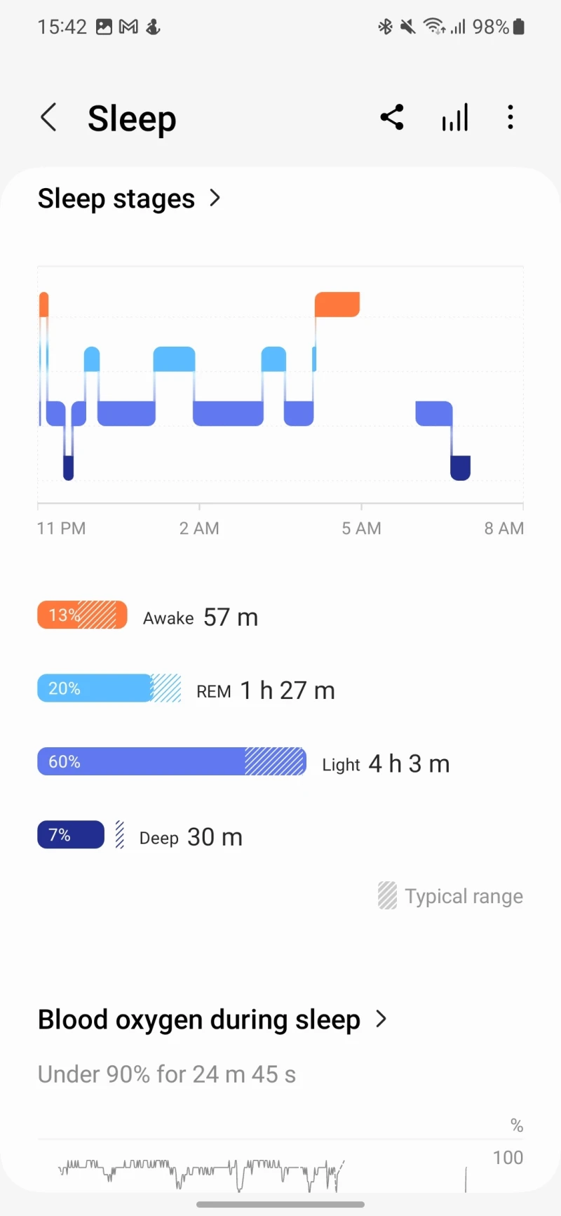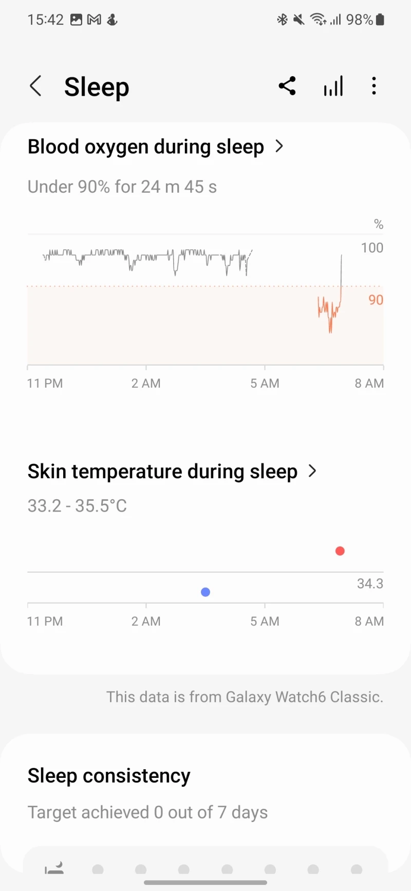 fWhat's more, I noticed that the Galaxy Watch 6 Classic would routinely log blood oxygen saturation levels well below 90% for more than twenty minutes, which has never before happened while using my Apple Watch.