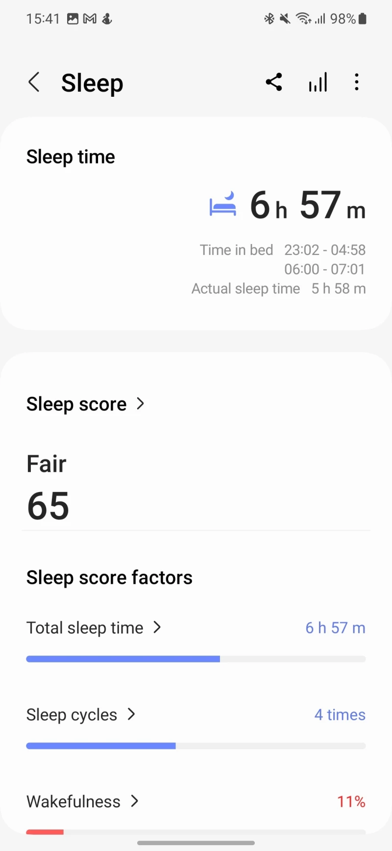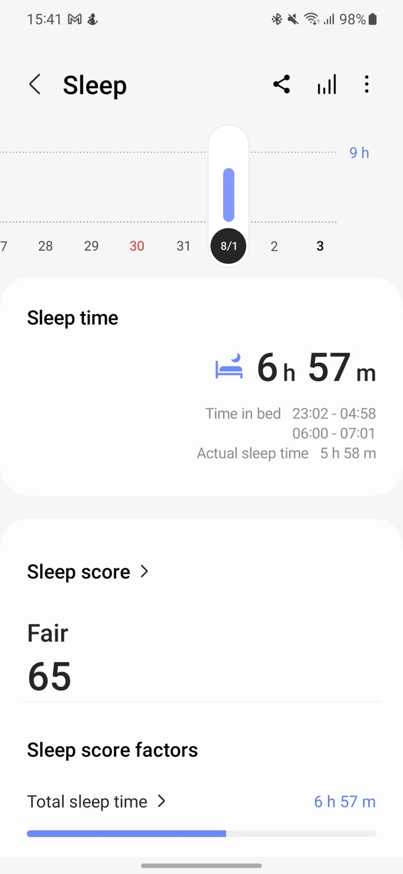 I noticed some weird metrics as well: despite logging 30 minutes of deep sleep, the Galaxy Watch 6 Classic only gave a fair score of 65 for that specific night's sleep. Meanwhile, Victor got a score of 80 with merely 7 minutes of the rejuvenating deep sleep.