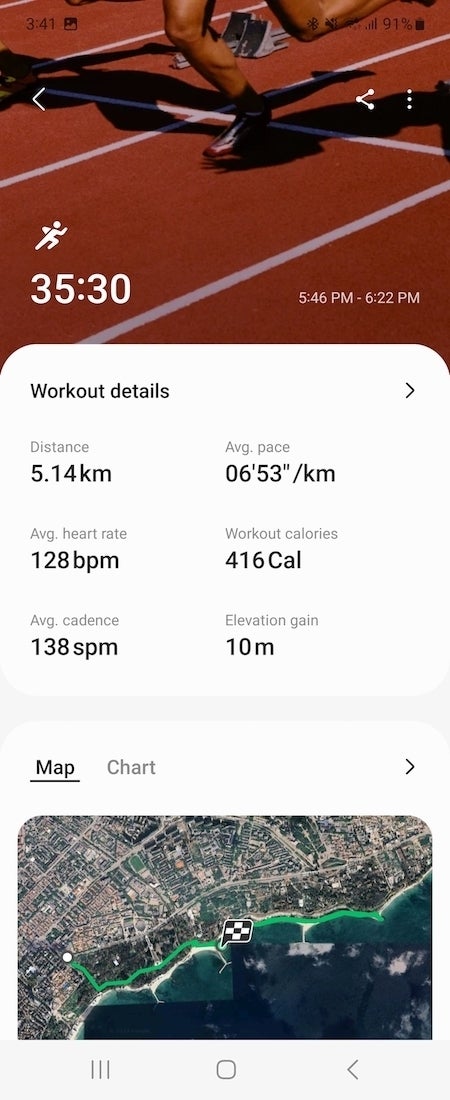 The Watch 6 also recorded a huge spike in heart rate at the beginning of the workout with peaks reaching more than 160bpm, while the same section was around 90bpm on the Apple Watch. We will be redoing this test with a chest strap soon, but the Apple Watch recordings are much closer to my actual perceived effort.