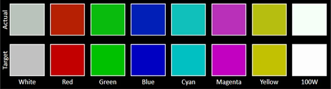 The Color accuracy chart gives an idea of how close a display's measured colors are to their referential values. The first line holds the measured (actual) colors, while the second line holds the reference (target) colors. The closer the actual colors are to the target ones, the better.
