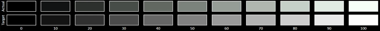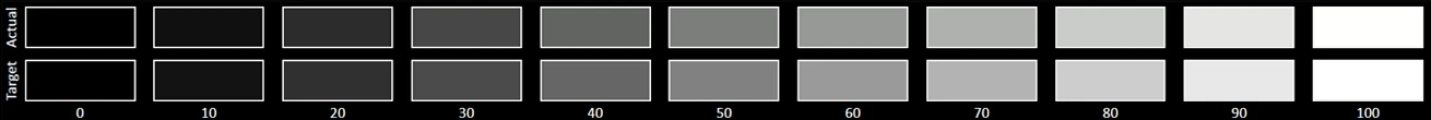 The Grayscale accuracy chart shows whether a display has a correct white balance(balance between red,green and blue)across different levels of grey(from dark to bright).The closer the Actual colors are to the Target ones,the better.