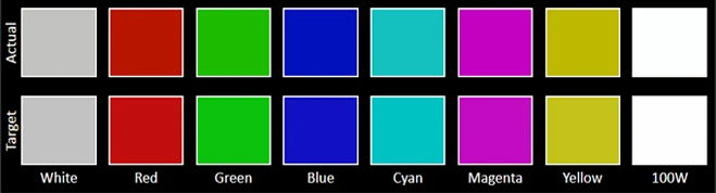 The Color accuracy chart gives an idea of how close a display's measured colors are to their referential values. The first line holds the measured (actual) colors, while the second line holds the reference (target) colors. The closer the actual colors are to the target ones, the better.