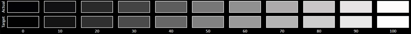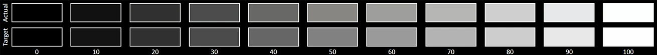 The Grayscale accuracy chart shows whether a display has a correct white balance(balance between red,green and blue)across different levels of grey(from dark to bright).The closer the Actual colors are to the Target ones,the better.