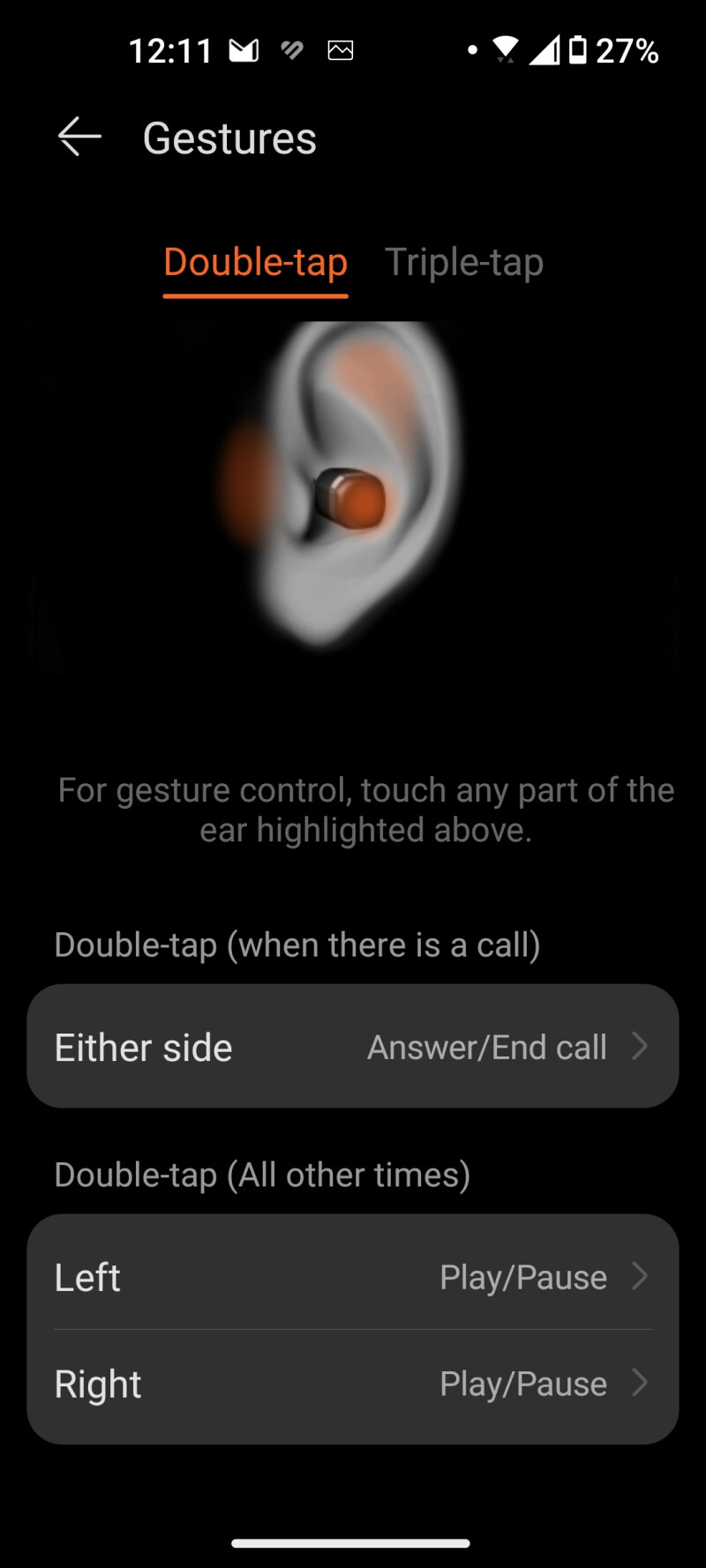 Gestures can be customized; by default, a double tap on each side answers or ends a call or pauses your music. Noise cancellation is controlled by triple tapping. You can make the buds wake your voice assistant or skip to the next song if you want.