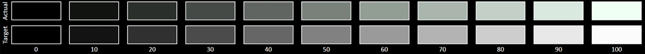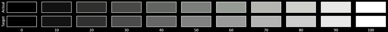 The Grayscale accuracy chart shows whether a display has a correct white balance(balance between red,green and blue)across different levels of grey(from dark to bright).The closer the Actual colors are to the Target ones,the better.
