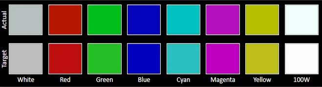 The Color accuracy chart gives an idea of how close a display's measured colors are to their referential values. The first line holds the measured (actual) colors, while the second line holds the reference (target) colors. The closer the actual colors are to the target ones, the better.
