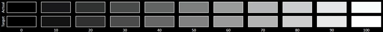 The Grayscale accuracy chart shows whether a display has a correct white balance(balance between red,green and blue)across different levels of grey(from dark to bright).The closer the Actual colors are to the Target ones,the better.