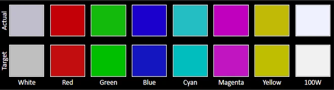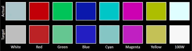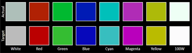 The Color accuracy chart gives an idea of how close a display's measured colors are to their referential values. The first line holds the measured (actual) colors, while the second line holds the reference (target) colors. The closer the actual colors are to the target ones, the better.