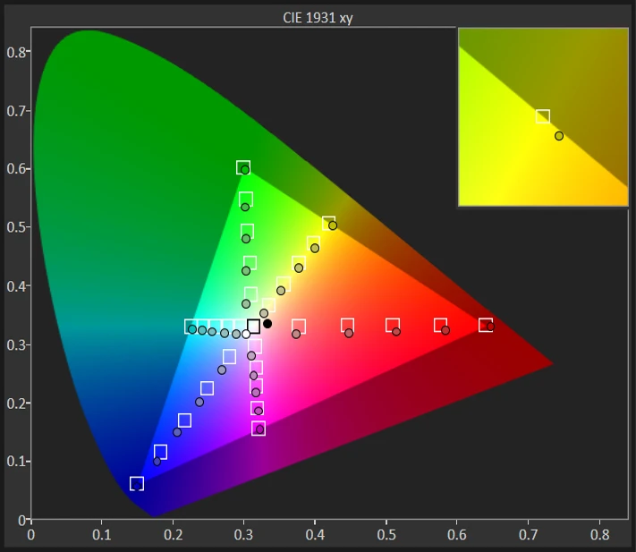 The CIE 1931 xy color gamut chart represents the set(area)of colors that a display can reproduce,with the sRGB colorspace(the highlighted triangle)serving as reference.The chart also provides a visual representation of a display's color accuracy. The small squares across the boundaries of the triangle are the reference points for the various colors, while the small dots are the actual measurements. Ideally, each dot should be positioned on top of its respective square. The 'x:CIE31' and 'y:CIE31' values in the table below the chart indicate the position of each measurement on the chart. 'Y' shows the luminance (in nits) of each measured color, while 'Target Y' is the desired luminance level for that color. Finally, 'ΔE 2000' is the Delta E value of the measured color. Delta E values of below 2 are ideal.