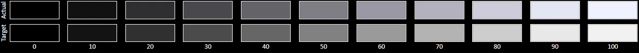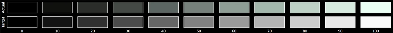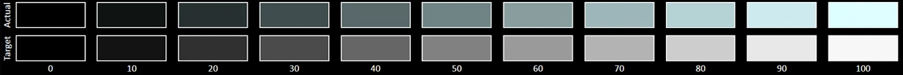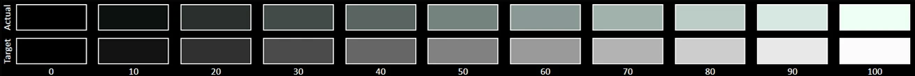 The Grayscale accuracy chart shows whether a display has a correct white balance(balance between red,green and blue)across different levels of grey(from dark to bright).The closer the Actual colors are to the Target ones,the better.