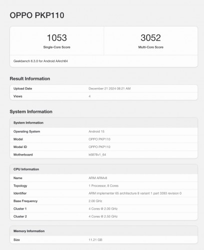 The Oppo A5 Pro has surfaced on Geekbench with the model number PKP110, consistent with earlier listings. According to the benchmark, the device is powered by MediaTek's Dimensity 7300 chipset and features a substantial 12GB of RAM. The performance scores from Geekbench show the A5 Pro achieving a single-core score of 1,053 and a multi-core score of 3,052, indicating robust processing power.