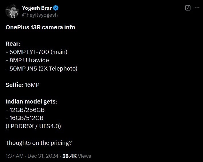 Moreover, Brar has disclosed exciting configurations for the OnePlus 13R destined for the Indian market. Users can expect a model featuring 12GB of LPDDR5X RAM paired with 256GB of UFS 4.0 storage. For those in need of even more power, there will be an option boasting an impressive 16GB of LPDDR5X RAM and 512GB of UFS 4.0 storage.