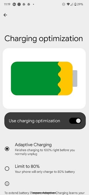 With Adaptive Charging, the device slows down its charging rate and pauses at 80% full to complete the remaining charge just before the user typically disconnects it in the morning. Users can activate this function by going to Settings > Battery > Charging optimization. There, they can toggle the "Use Charging Optimization" option and choose between Adaptive Charging or stopping at 80% battery capacity.