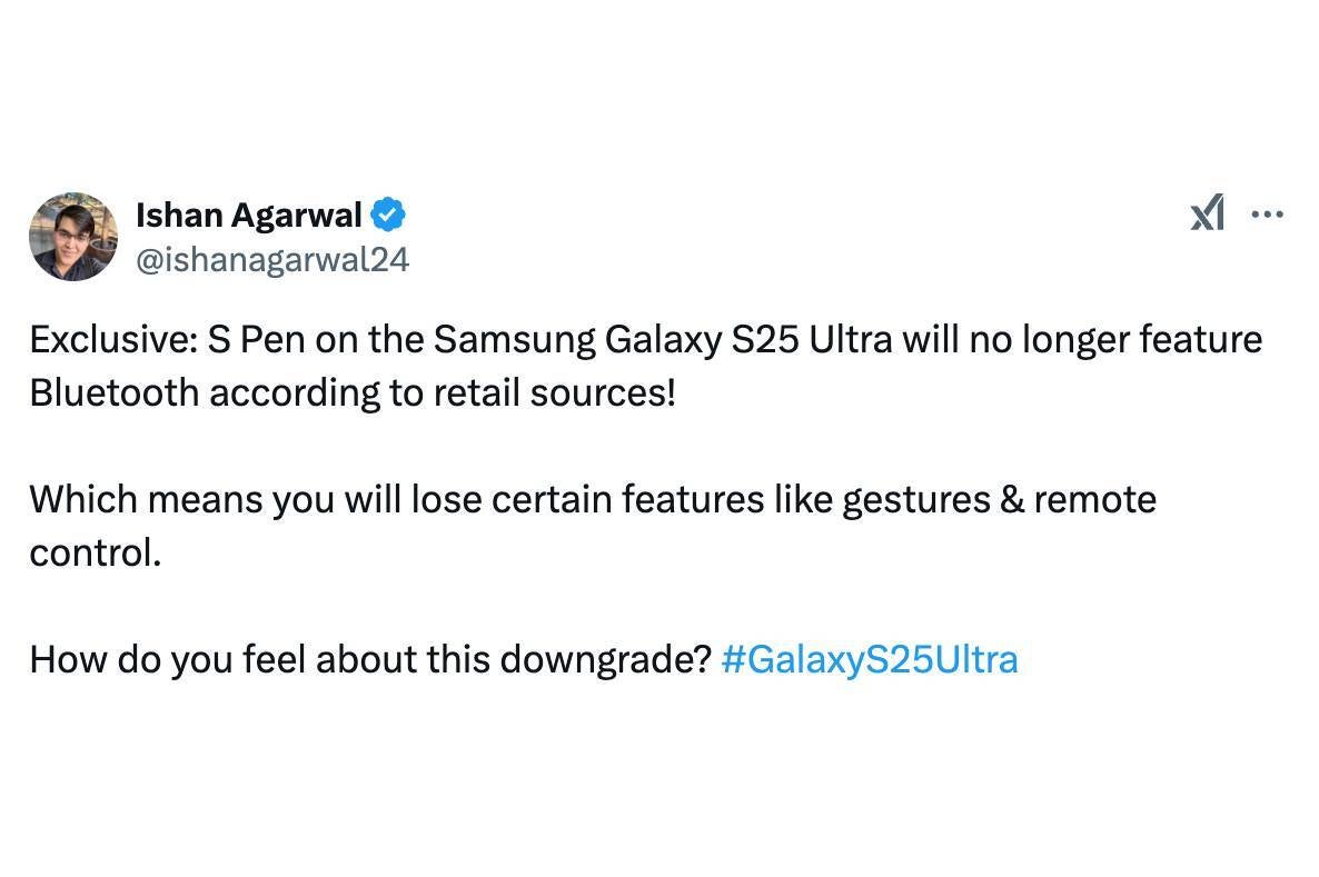 The Galaxy S25 Ultra may be providing a less advanced version of the S Pen. | Image Credit - Ishan Agarwal, X