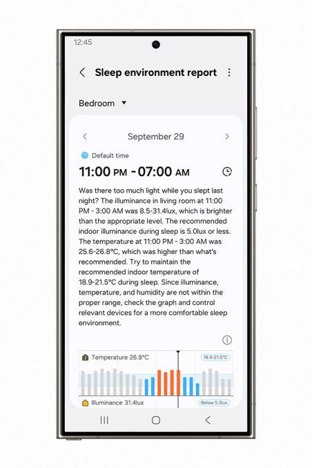 The Samsung Health app has introduced an exciting Sleep environment report, which evaluates aspects like temperature, humidity, and light conditions in the user's sleeping area by utilizing SmartThings-enabled devices. Following the analysis, users receive personalized suggestions to optimize their sleep space. The app can also coordinate with SmartThings to automatically adjust room settings for improved sleep conditions.