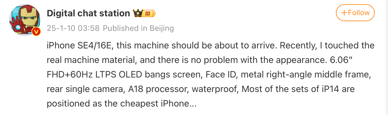 Digital Chat Station has provided exciting new details about the anticipated iPhone SE 4, also referred to as the iPhone 16E, which is set to make its debut in the spring. This revamped model appears to be a significant upgrade, shedding the outdated styling of its predecessors in favor of a more modern design reminiscent of the iPhone 14. The new phone is expected to feature Face ID technology housed in a notch and will maintain a sturdy metal frame alongside a single rear camera. Driving this device will be Apple's new A18 processor, the same powerful chip found in the iPhone 16 and iPhone 16 Plus. Additionally, users can expect enhanced peace of mind with a water resistance rating.