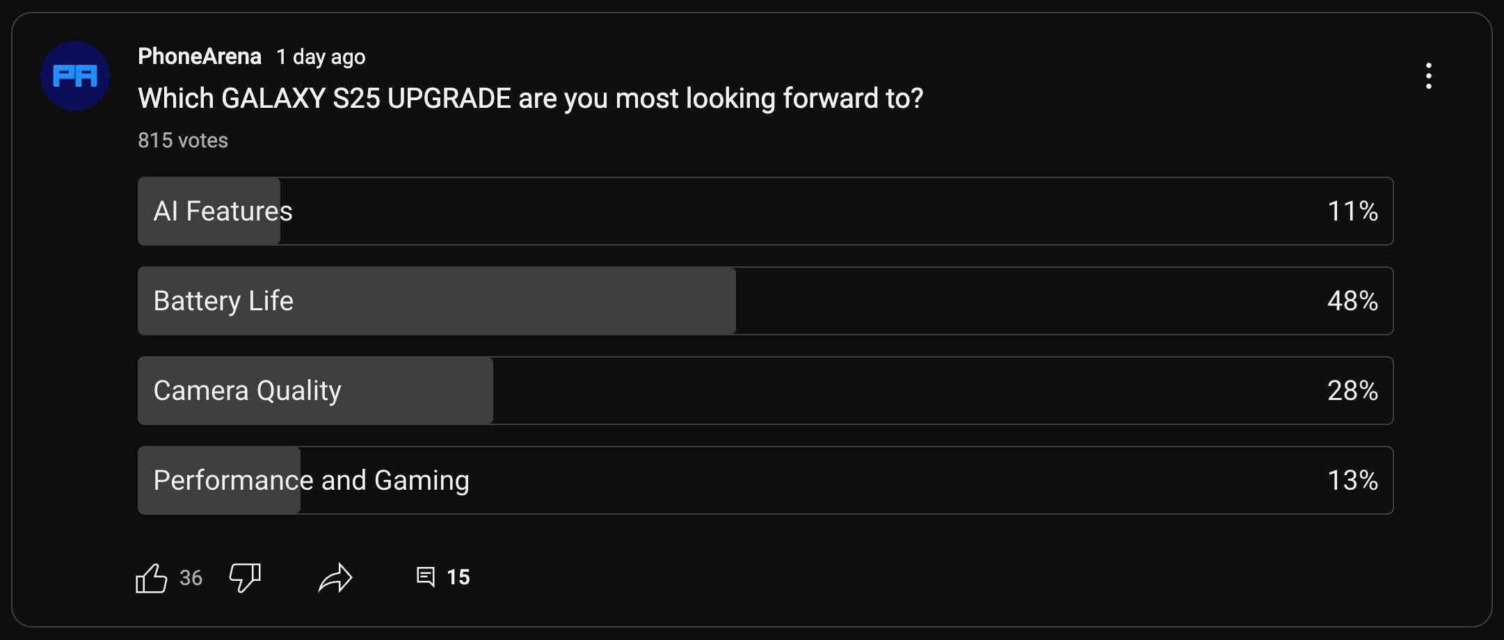 The feedback was illuminating: 48% of participants indicated that enhanced battery life was their top priority, 28% would prefer camera enhancements, and only 11% felt that AI improvements were the most critical.
