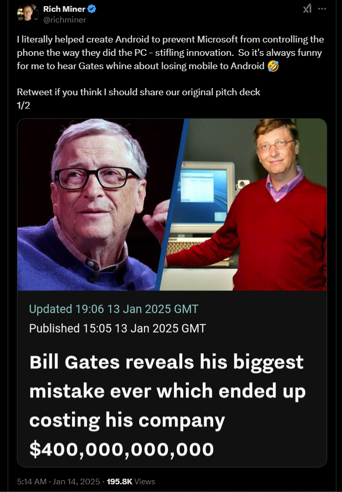 In a recent post on X, Rich Miner, one of the co-founders of Android, expressed his thoughts on Bill Gates’ comments regarding Microsoft’s loss in the mobile market to Android. Miner reflects on the motivations behind the creation of Android and the implications it had on mobile innovation.