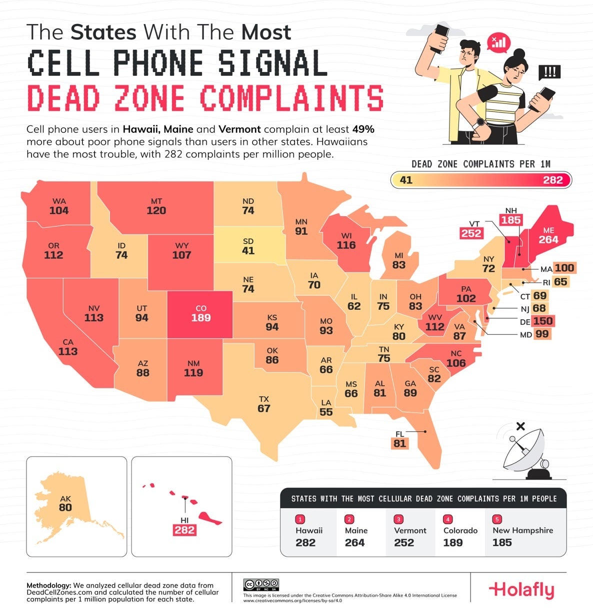 Cellular dead zone complaints for each state per one million residents. | Image credit-Holafly