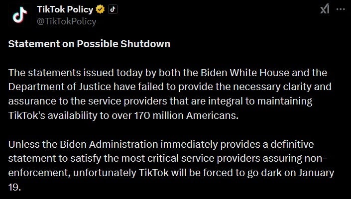 On Friday, TikTok released a statement highlighting that the Biden administration and the Department of Justice have "failed to provide the necessary clarity and assurance to the service providers that are integral to maintaining TikTok's availability to over 170 million Americans." TikTok cautioned that "unless the Biden Administration immediately provides a definitive statement ensuring non-enforcement, unfortunately, TikTok will be forced to go dark on January 19."