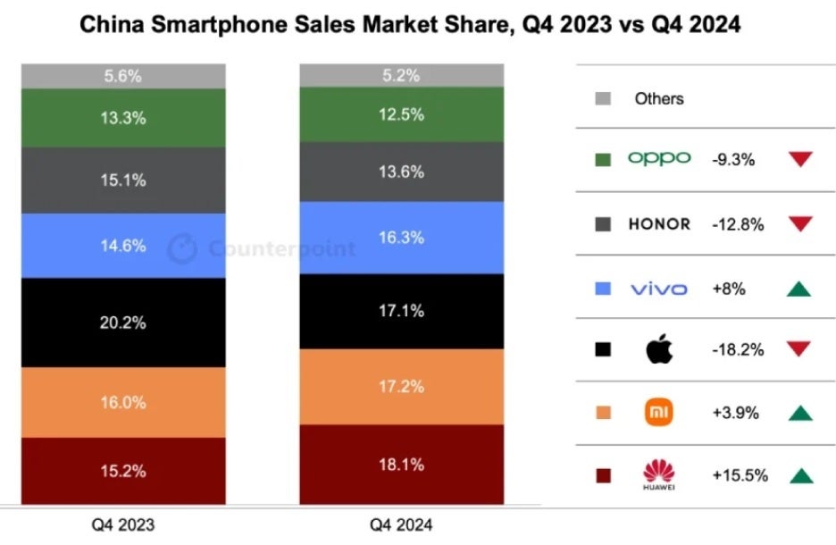 A recent report from Counterpoint has highlighted Huawei's significant rebound in the competitive Chinese smartphone landscape, showcasing a remarkable growth in sales during the last quarter of 2024. With a 15.5% increase in sales, Huawei reclaimed the top position in the Chinese market with an impressive market share of 18.1%. This marks a notable jump from the third-place position it held in the same quarter last year, where it had a 15.2% market share.