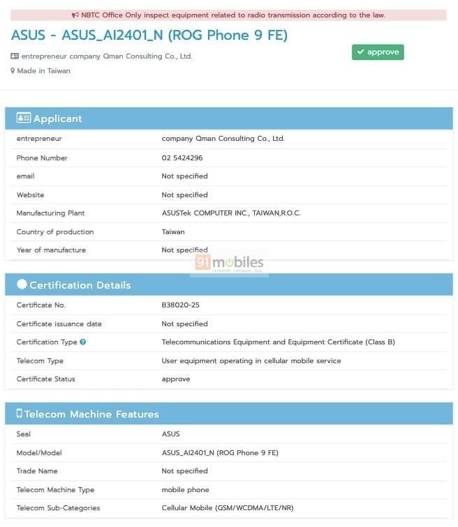 ROG Phone 9 FE certification | Image credit: 91mobiles