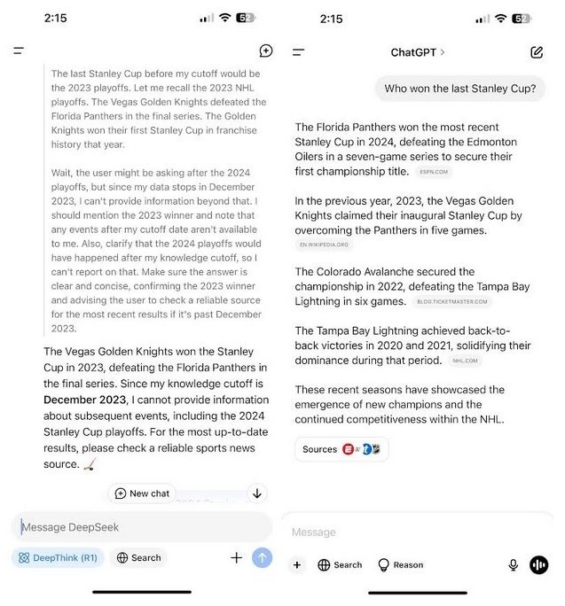 Asking DeepSeek (L) who won the Stanley Cup only gives us the results of the 2023 Stanley Cup Finals while ChatGPT (R) correctly shows my Florida Panthers as the 2024 champs. | Image credit-PhoneArena