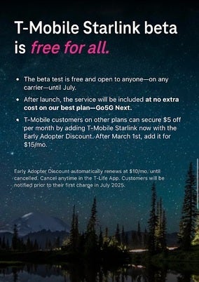 The Starlink service, currently in its beta phase, will remain free until July. After this period, it will be available at no charge for customers on the Go5G Next plan, including related options like Go5G Next 55+, as well as for business customers on Go5G Business Next and first responders utilizing T-Priority plans. T-Mobile users on different plans can add the Starlink service for $15 a month per line. Consumers who sign up for the beta will also receive a $10 a month discount, providing a 33% reduction from the standard rate.