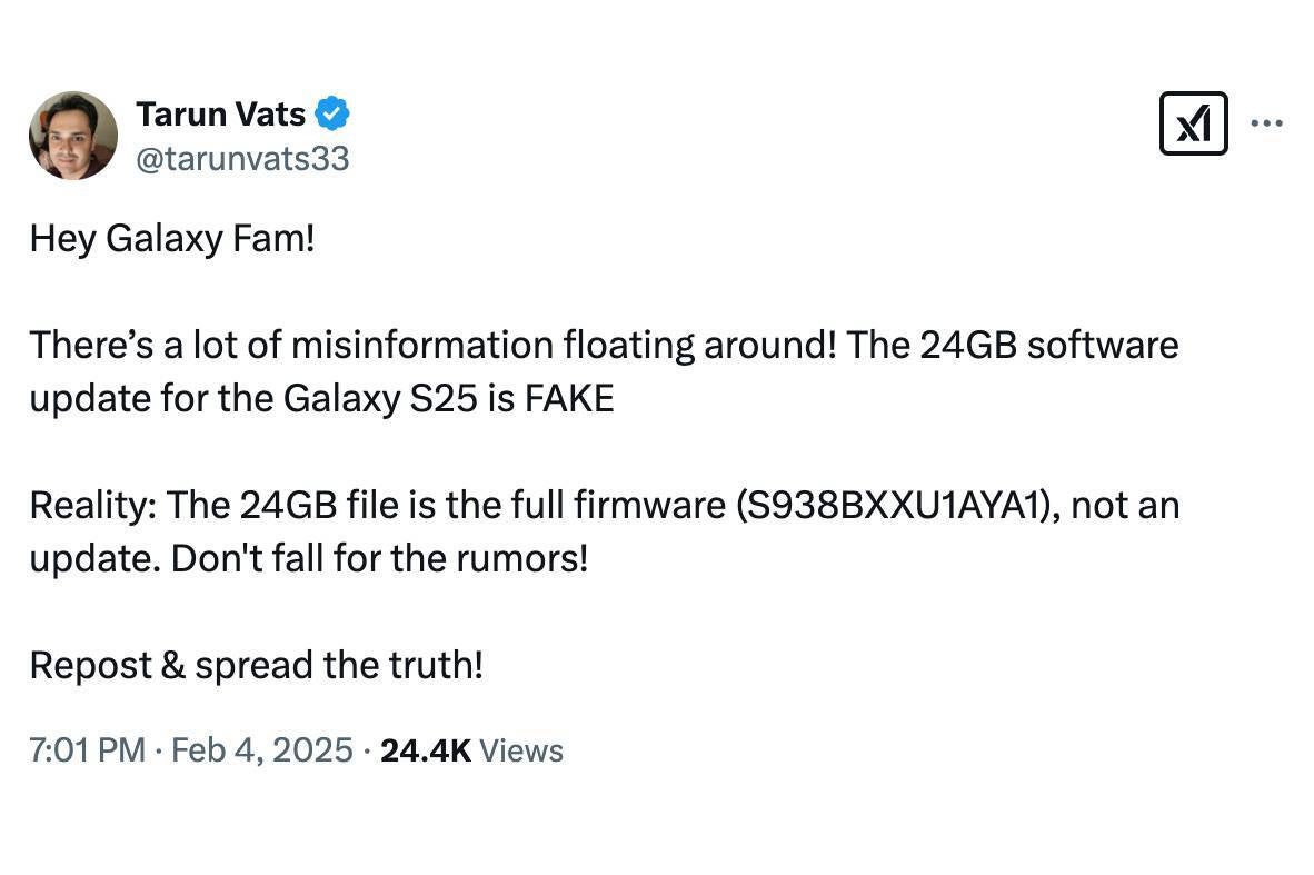 The first update for the Galaxy S25 will not be a massive 24GB.