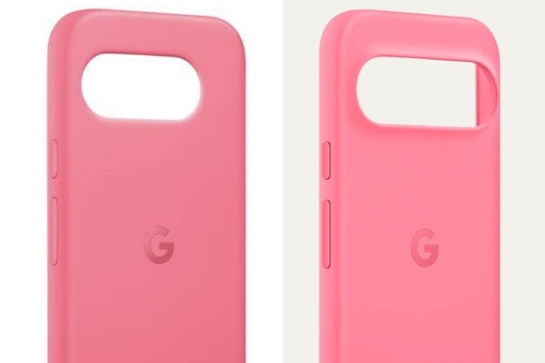 Comparison between the leaked Pixel 9a case (left) and the existing Pixel 9 case. | Images credit — Android Authority and Google