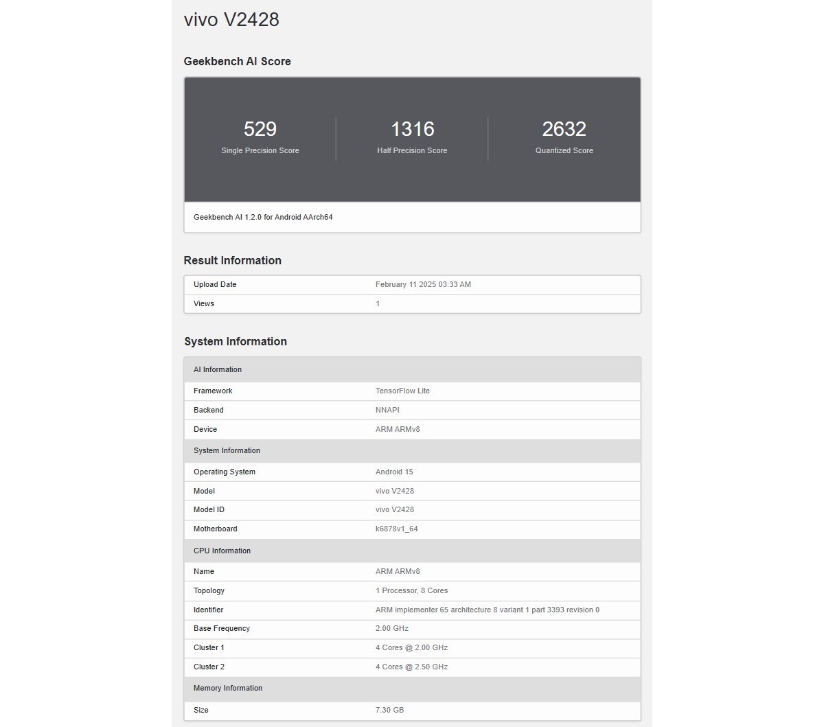 According to the benchmark results, the vivo V50e, identified with the model number V2428, will be equipped with the MediaTek Dimensity 7300 SoC— the same chipset that powered its predecessor, the V40e, released just a few months prior. This consistent choice of processor suggests that vivo aims to maintain performance levels across its V series.