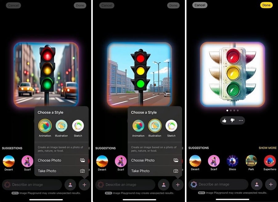 Image Playground styles from L to R, Animation, Illustration, and the new Sketch. | Image credit-PhoneArena