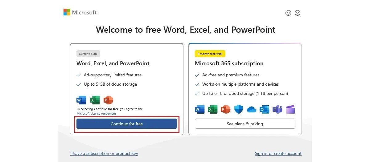 If you prefer to skip the sign-in, click "Skip for now" and you'll be greeted by a welcome message for the free Word, Excel, and PowerPoint versions.