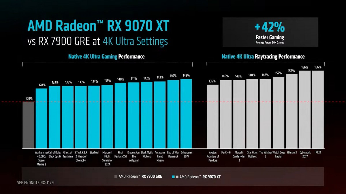 Benchmark results from AMD illustrate the RX 9070's impressive performance, showing it to be 21% faster than the RX 7900 GRE at 4K resolution across a variety of games, particularly excelling in ray tracing scenarios thanks to enhancements from RDNA 4 architecture. The RX 9070 XT takes the lead with an impressive 42% performance boost compared to the RX 7900 GRE and is positioned as a strong competitor against Nvidia's $750 RTX 5070 Ti, trailing by just 2% in average benchmarks.