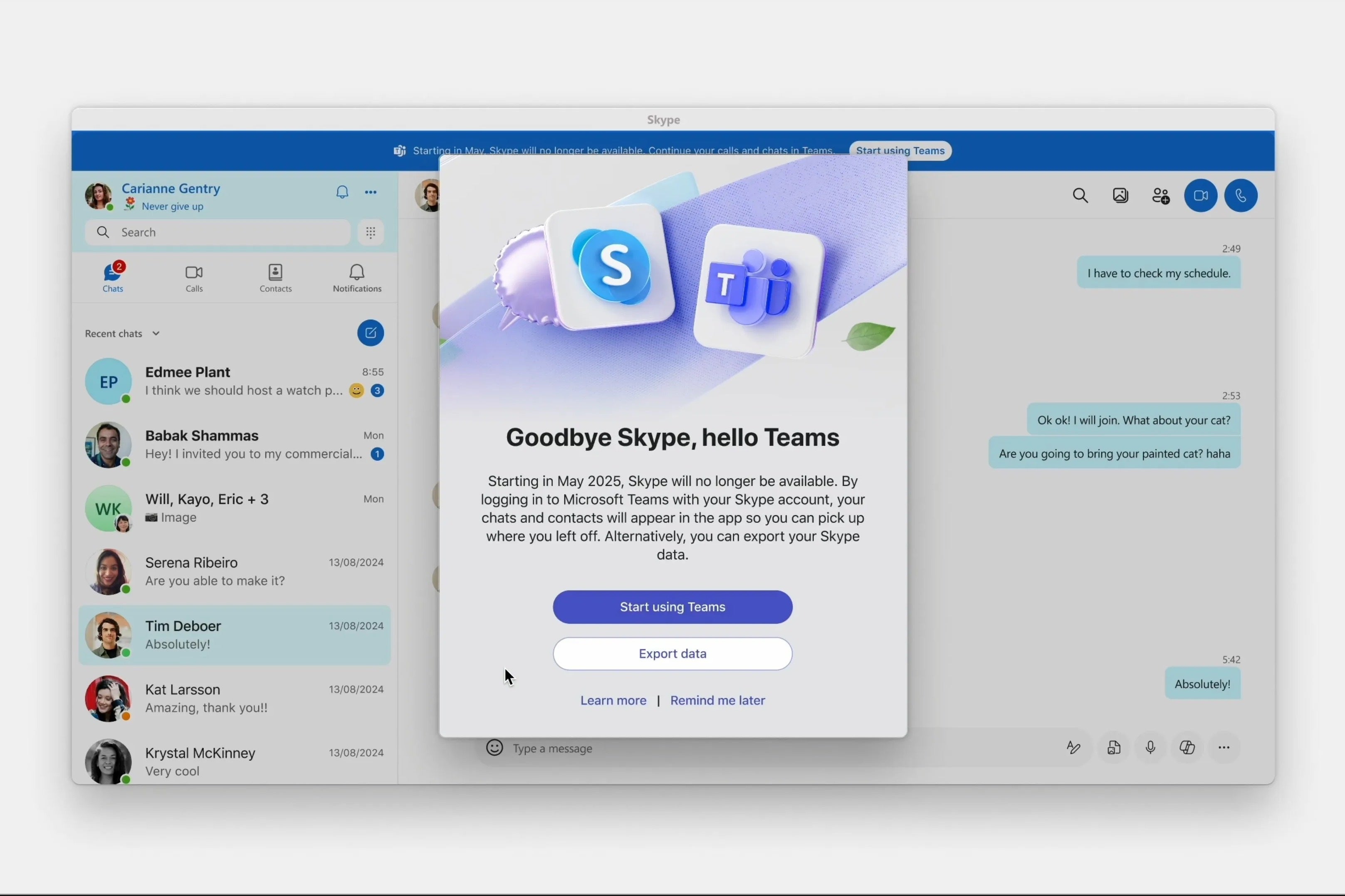 Notification alerting Skype users about the upcoming changes. | Image credit — Microsoft