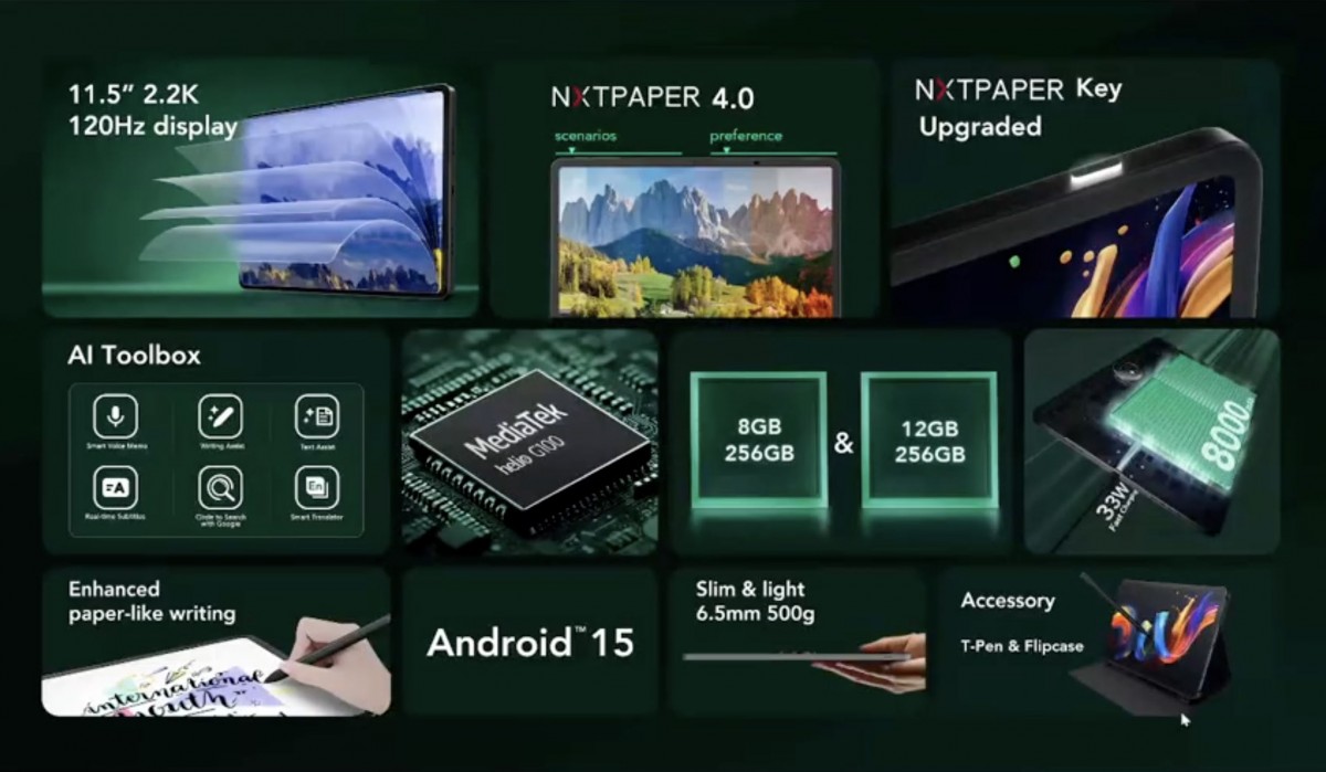 On the hardware front, the Nxtpaper 11 Plus is powered by the MediaTek Helio G100 chipset and can be configured with either 8GB or 12GB of RAM, alongside 256GB of internal storage. Its sleek design measures just 6.5mm thick and weighs 500 grams. The tablet is equipped with an 8,000 mAh battery that supports 33W wired charging and runs on Android 15, certified for Android Enterprise Recommended standards.