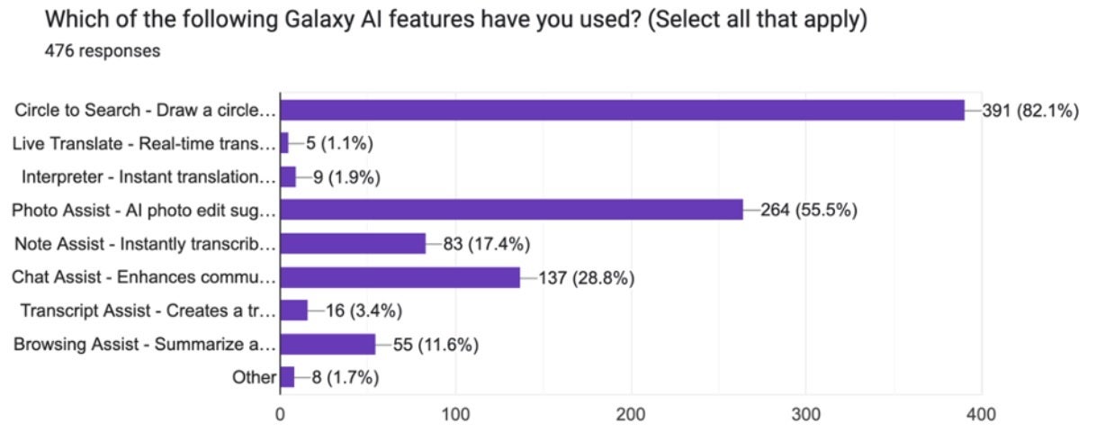 A significant portion of Samsung users embraced AI, with 82.1% experimenting with Circle to Search. Other favorites include Photo Assist (55.5%) and Chat Assist (28.8%).