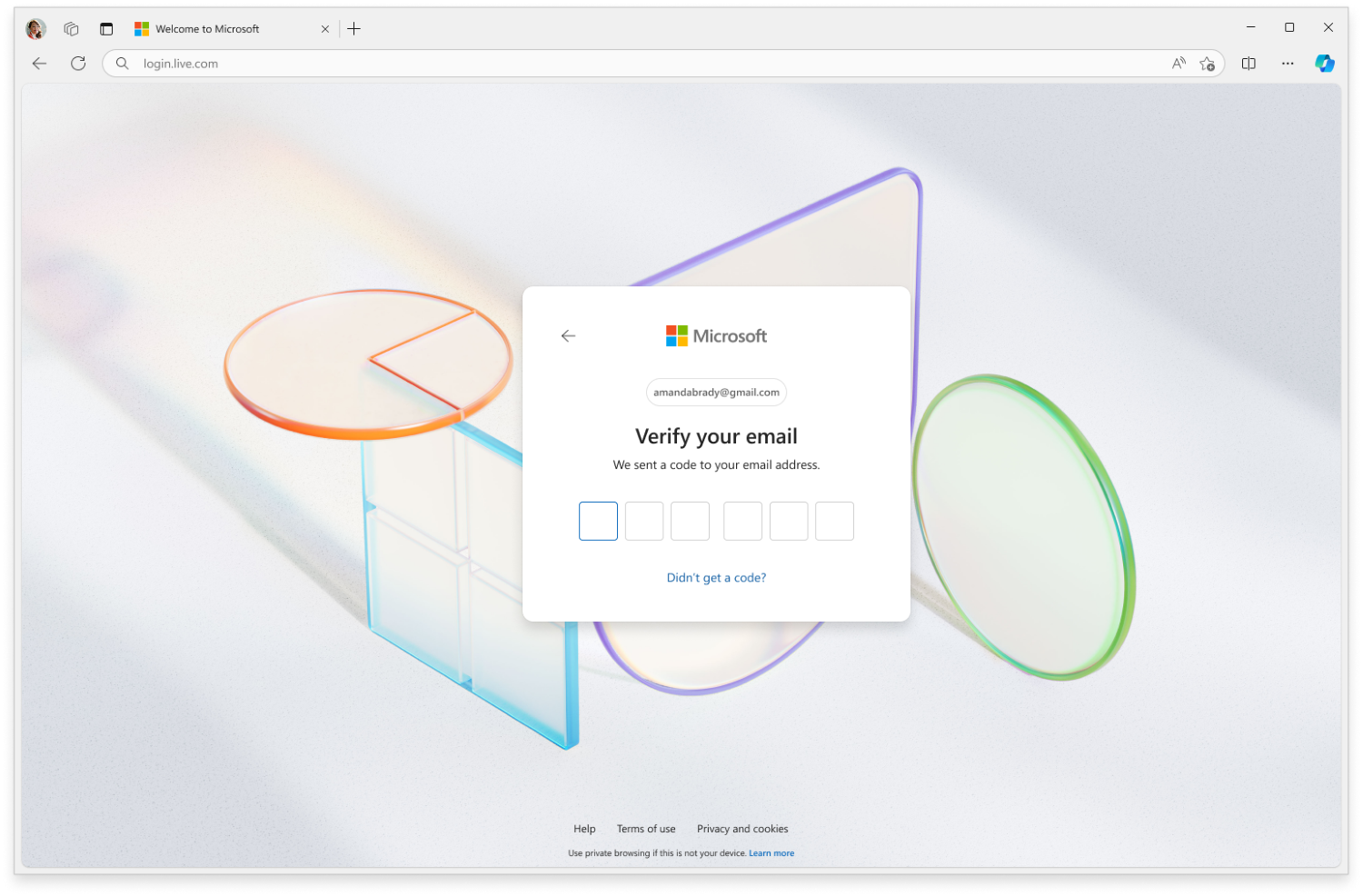 This is the new code entry screen for Microsoft account creation. | Image credit – Microsoft