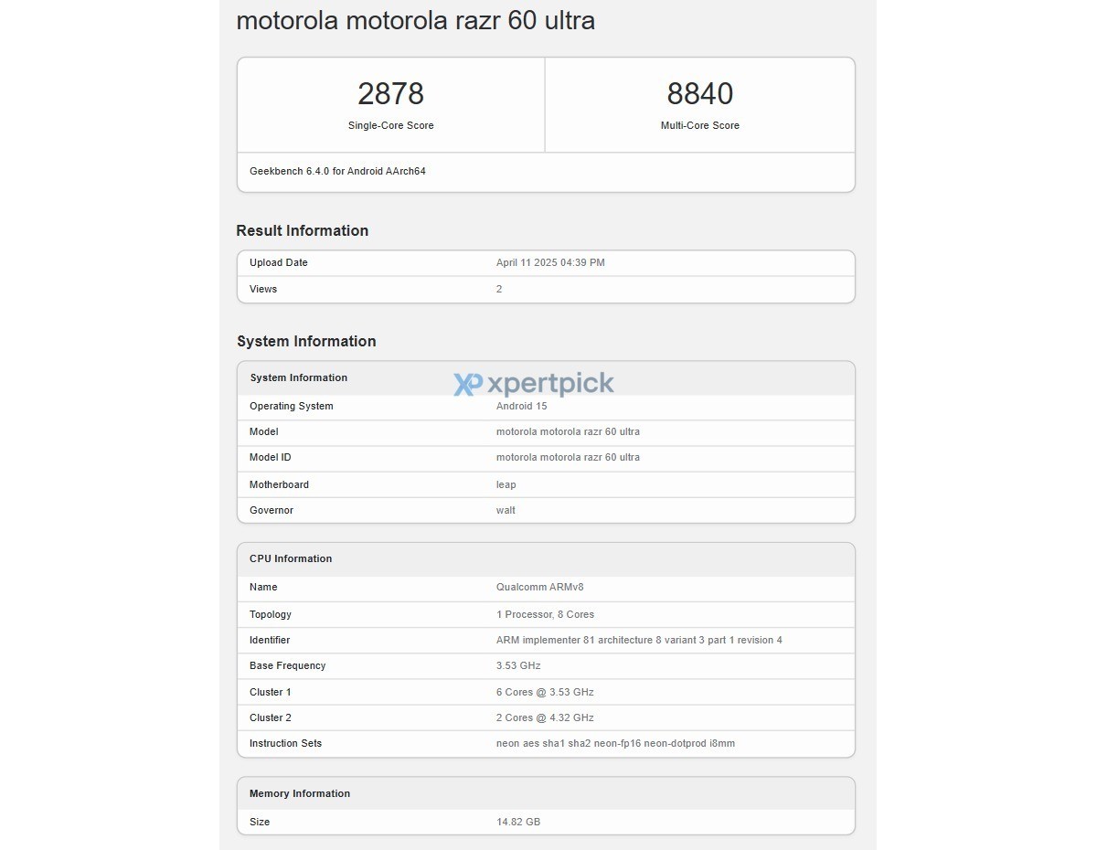 The device was recently spotted on Geekbench, where it showcased impressive performance capabilities with 16GB of RAM and Android 15 out of the box. Rumors suggest that the Razr 60 Ultra will boast a large 6.96-inch folding screen with a high 165 Hz refresh rate, along with a 4" cover display.