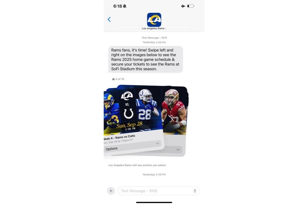 Promotional RCS message by the LA Rams received. | Image credit — Judy_Gamble on Reddit