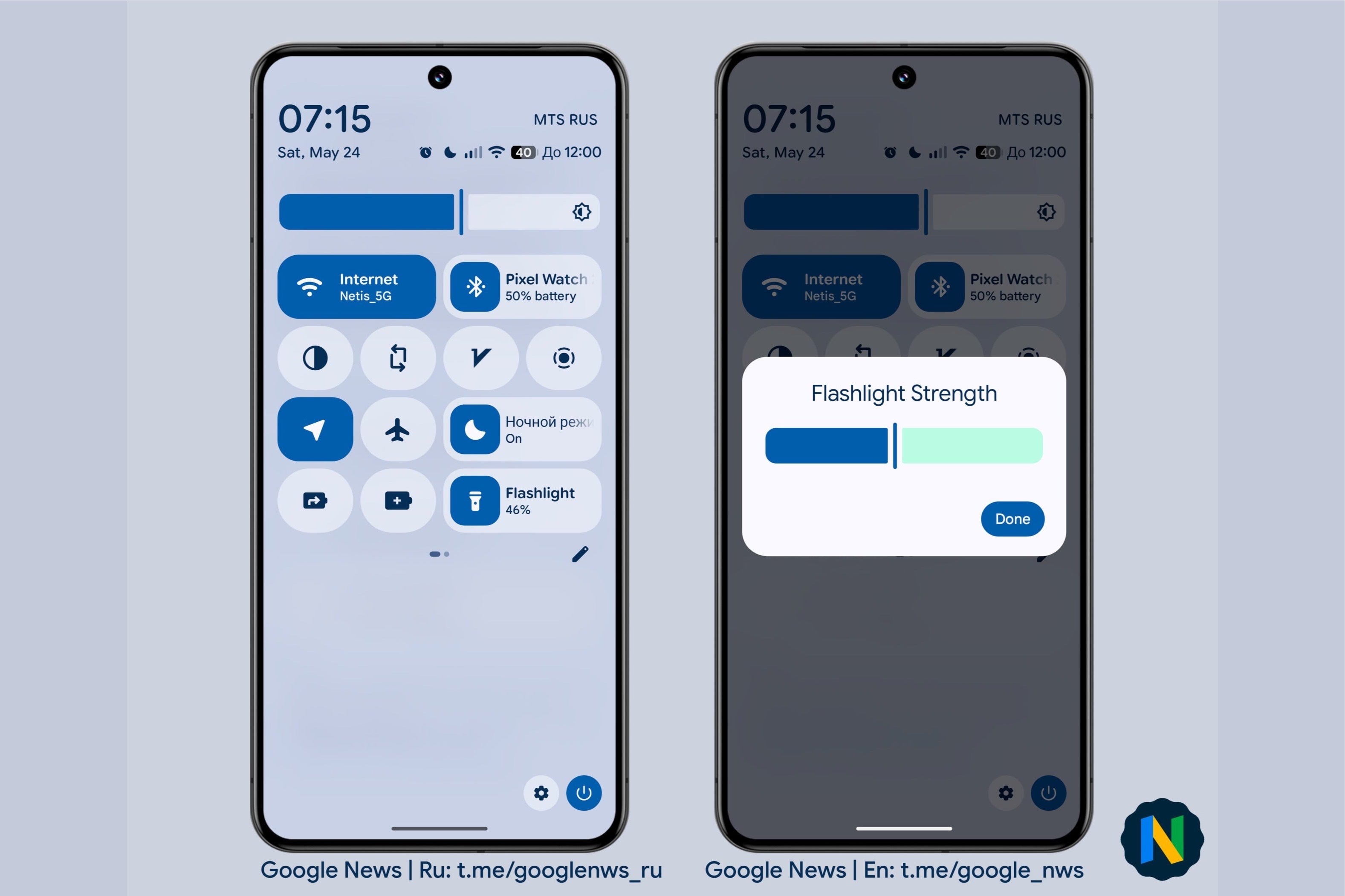 Adjusting the strength of your flashlight will soon be available on Pixel phones. | Image credit — Google News (Telegram)
