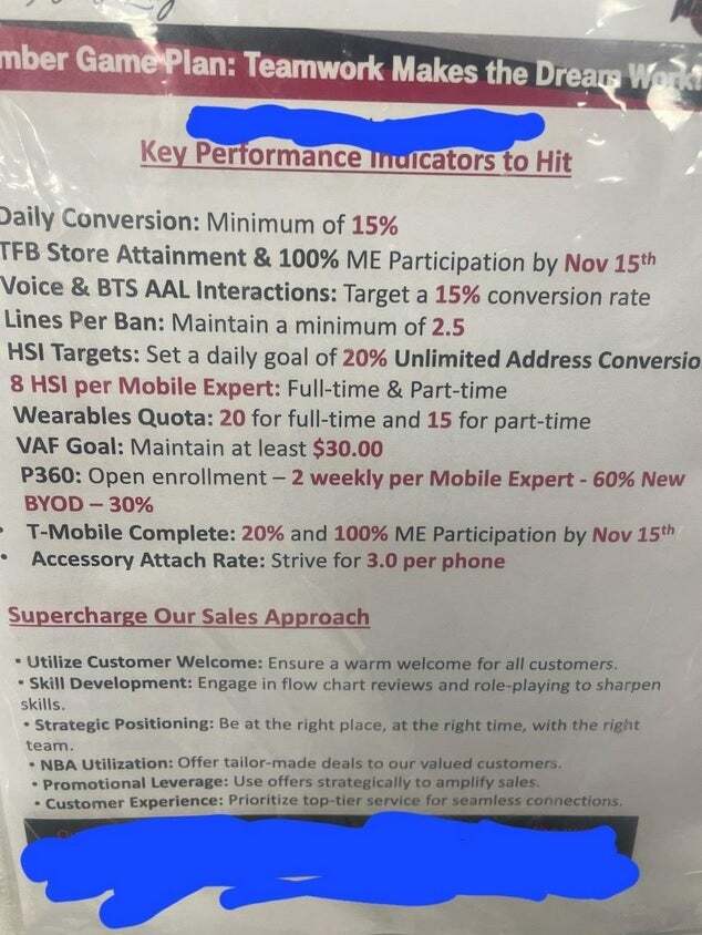 An image leaked showing monthly goals for a T-Mobile corporate store rep. | Image credit: Reddit