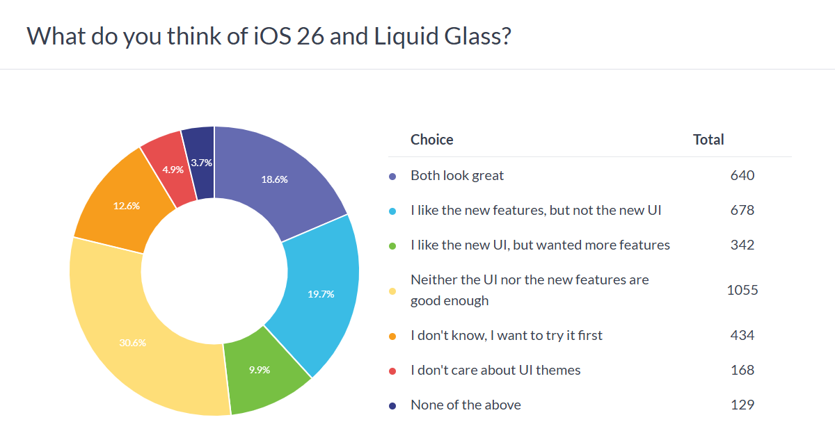 While a considerable number of voters expressed dissatisfaction with both the new features and the updated look, some of this sentiment can be attributed to a general bias against Apple products. Nonetheless, longtime Apple users have raised concerns about the direction of the UI changes.
