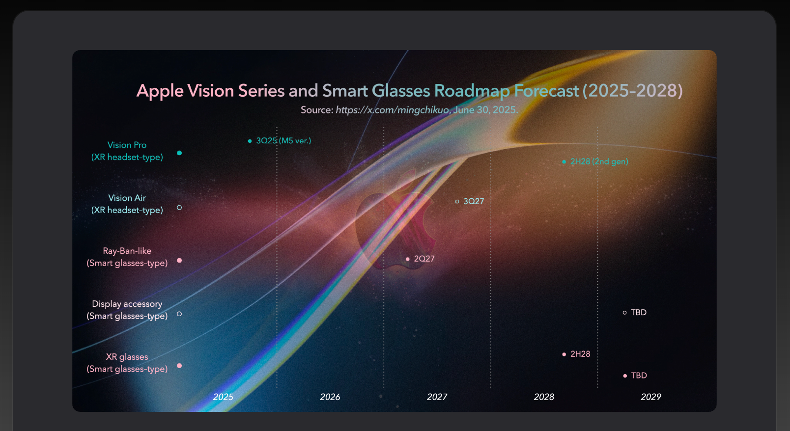 Apple is also updating its XR headset, Vision Pro, with a new M5 chip set for mass production in Q3 2025. A limited release is planned to bridge the gap until the launch of Vision Pro 2, slated for the second half of 2028. This next-gen model will feature a redesigned chassis, Mac-grade processor, and a more affordable price point.