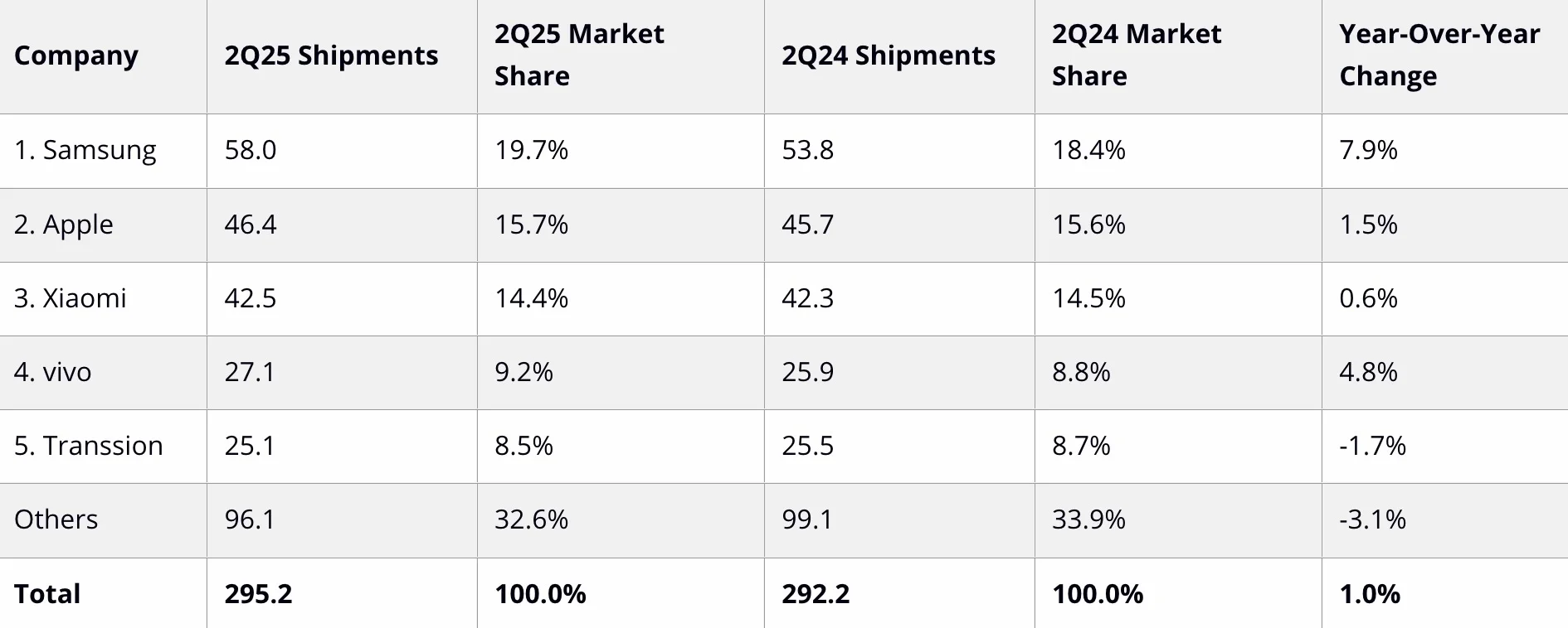 Xiaomi secured the third spot with 42.5 million units shipped and a 14.4% market share, with minimal growth of 0.6%. vivo and Transsion followed with 27.1 million and 25.1 million shipments respectively.