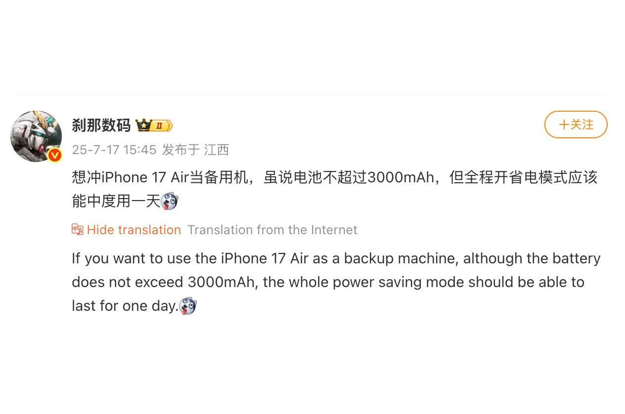 A celebrated leaker has indicated that the iPhone 17 Air's battery capacity will fall below the 3,000mAh mark.