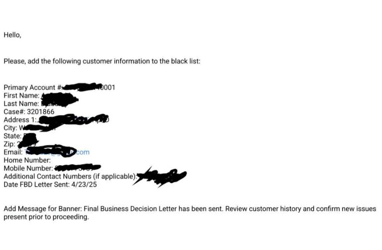 An alleged email from Verizon requesting that the customer be blacklisted was sent after the OAG got involved.