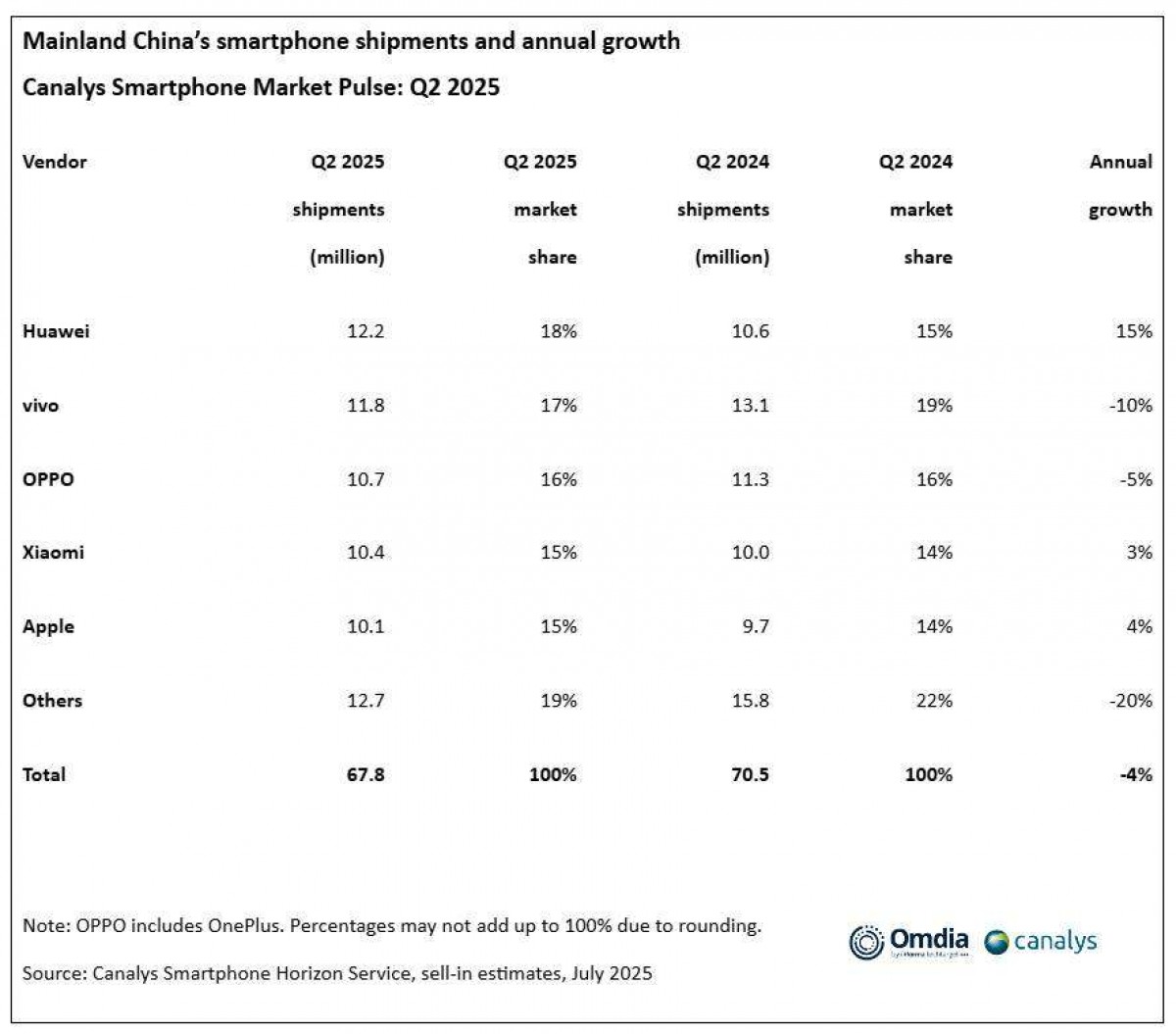 The success of Huawei can be attributed to its HarmonyOS 5.0-powered Nova 14 series, which proved to be a key factor in driving sales during Q2. Following closely behind Huawei was vivo with 11.8 million units shipped, holding a 17% share of the market. Oppo, including OnePlus models, secured the third spot with 10.7 million units shipped.