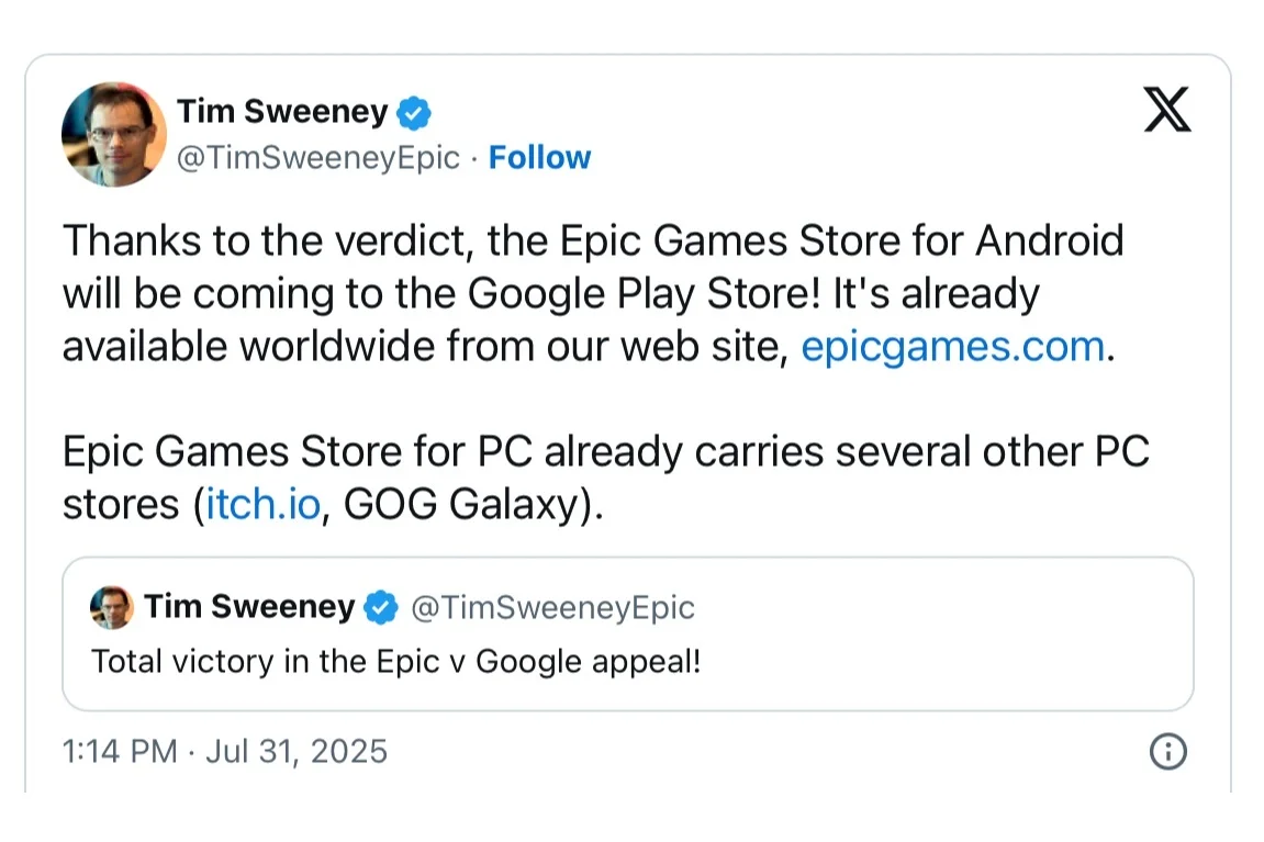 Epic Games CEO announces the imminent arrival of the Epic Games Store to the Play Store. | Image credit — @TimSweeneyEpic (X)